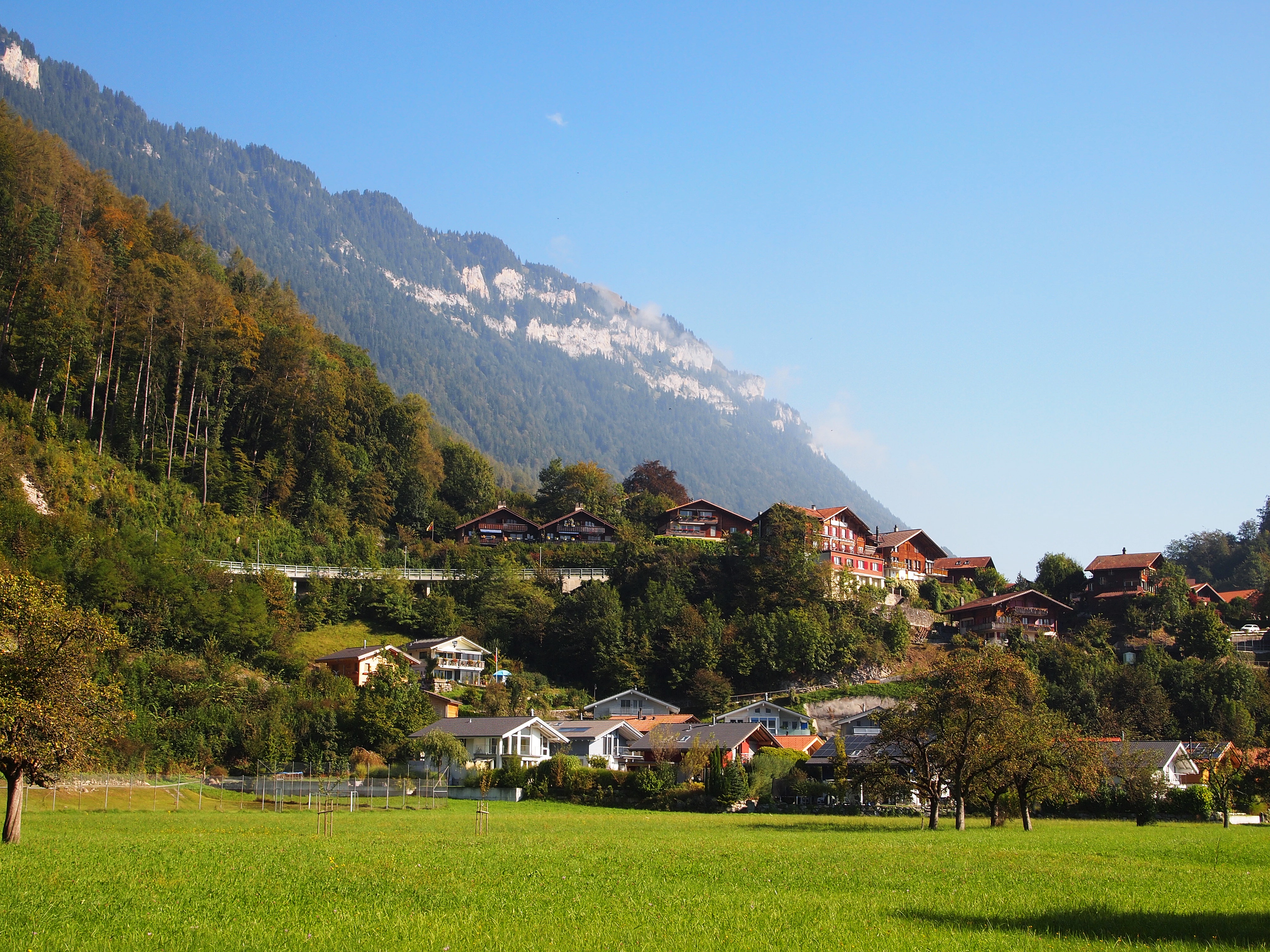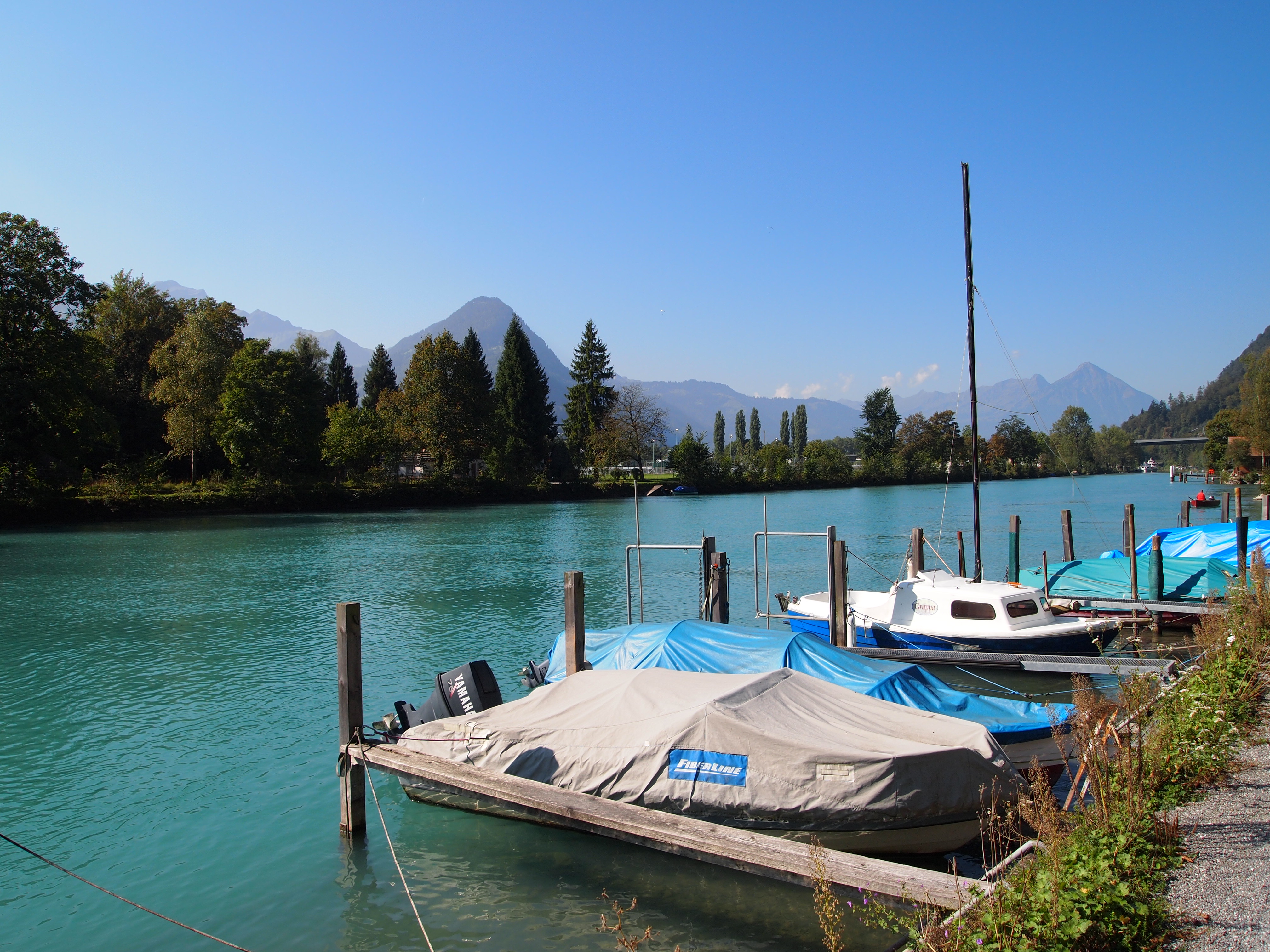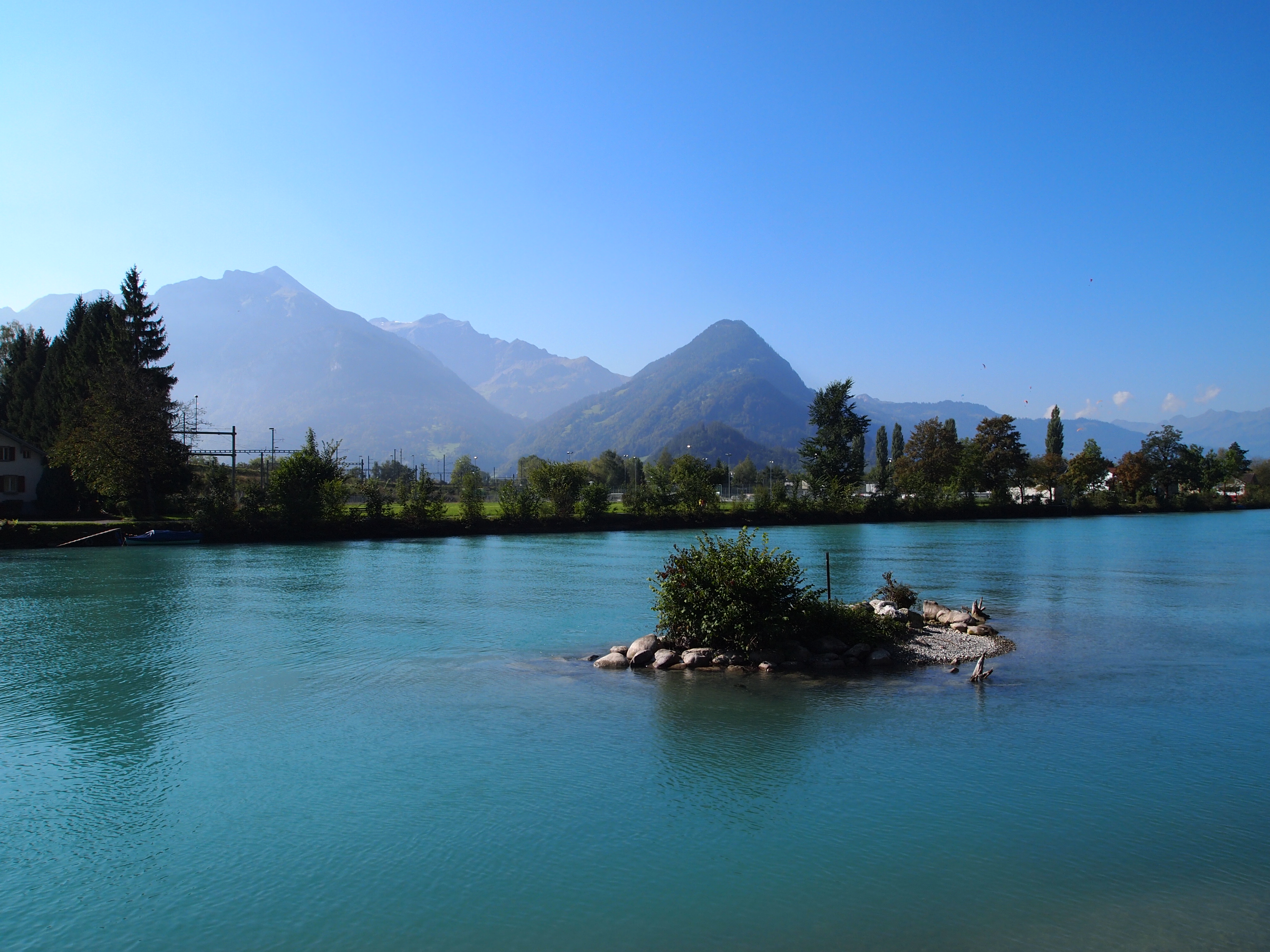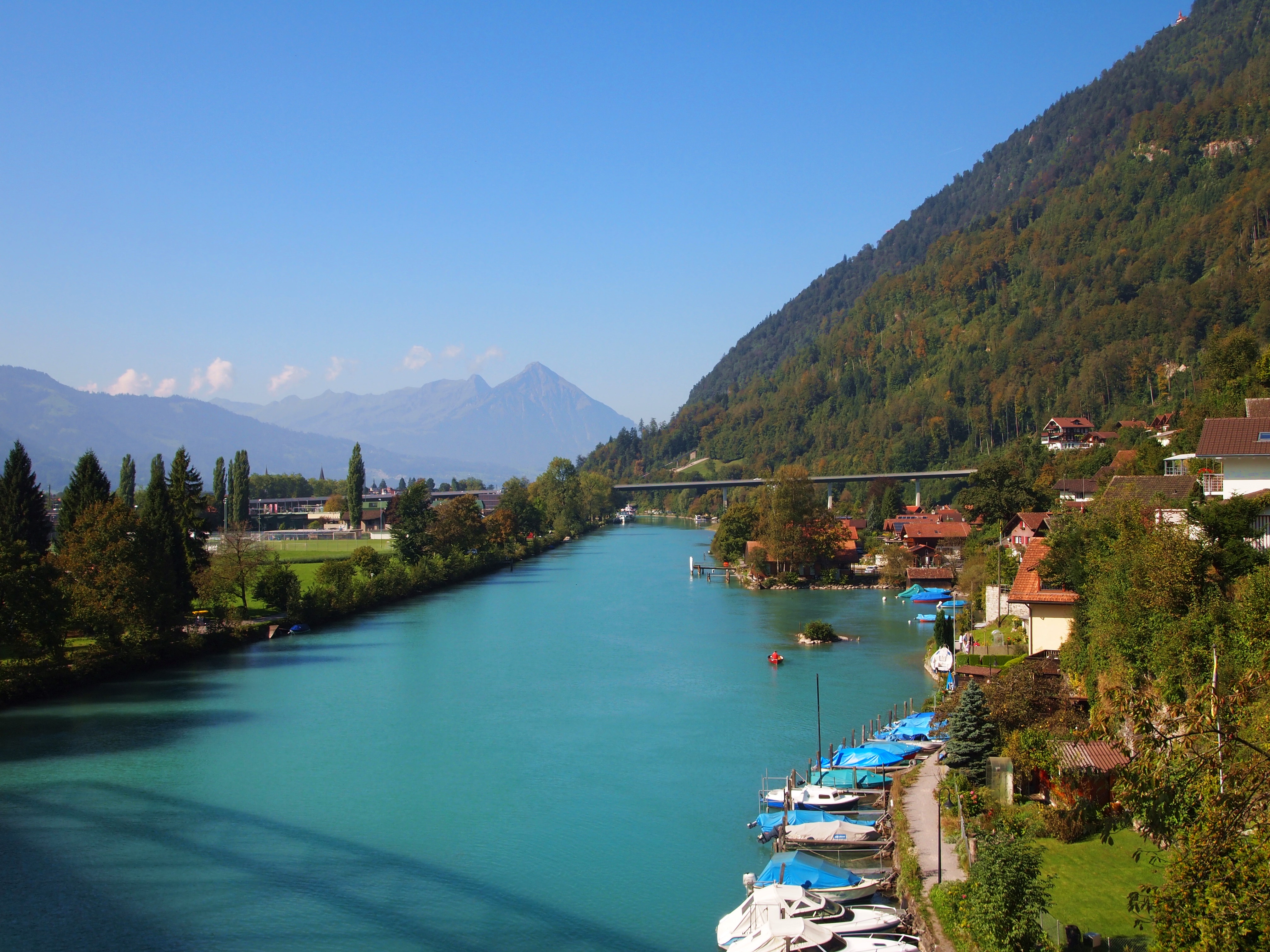 “Interlaken” is German for “between lakes.” The name refers to the two lakes on either side of the city – Thun and Brienz. They’re connected by the Aare tributary, a pale blue river stretching from east to west. The waters (mostly Brienz and the Aare) are a distinct, exotic-looking turquoise color, somewhat reminiscent of the shallow and warm waters of the Caribbean. These waters are anything but shallow and warm, though. Their color comes instead from glacial deposits. The silt-like material left behind from the glacial movements reflects sunlight just so, making the waters look bright, light aqua.