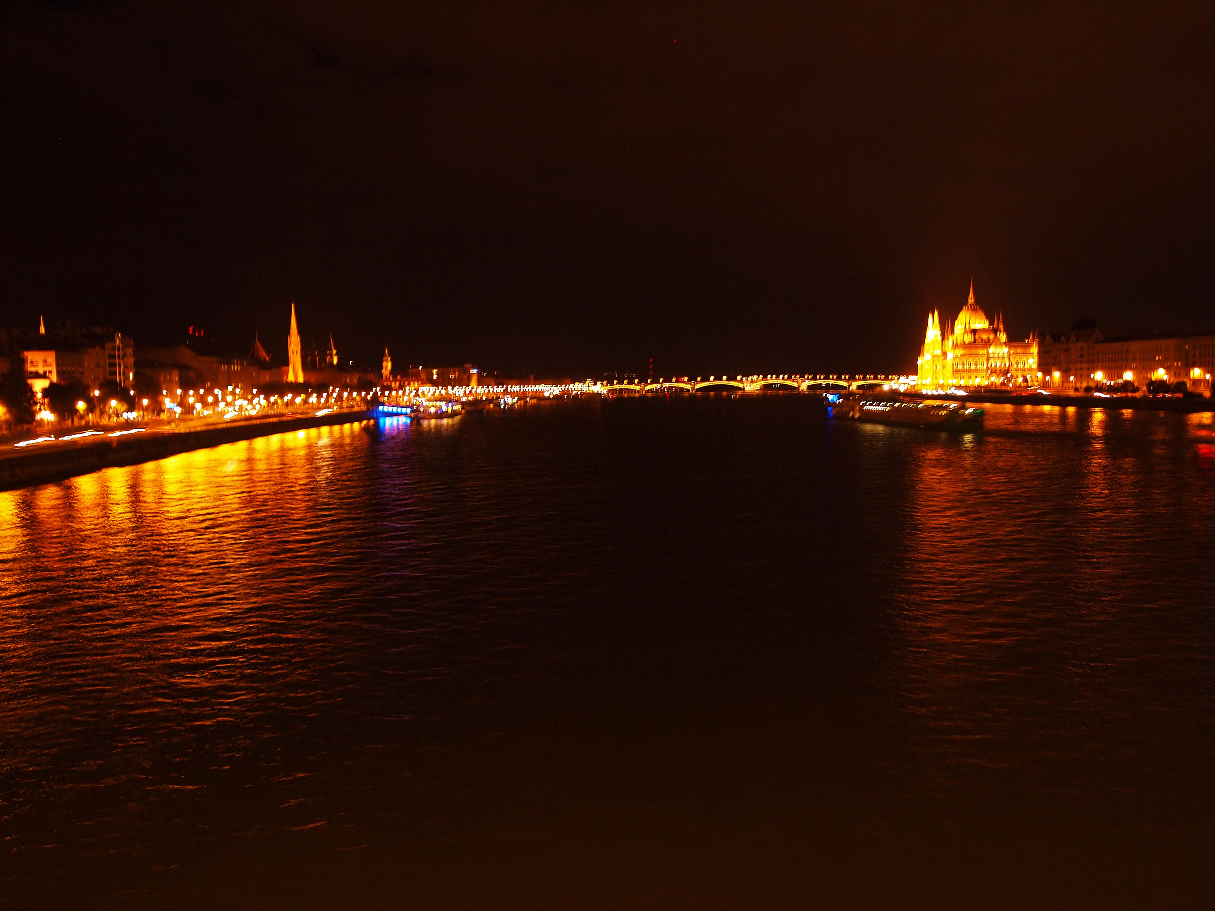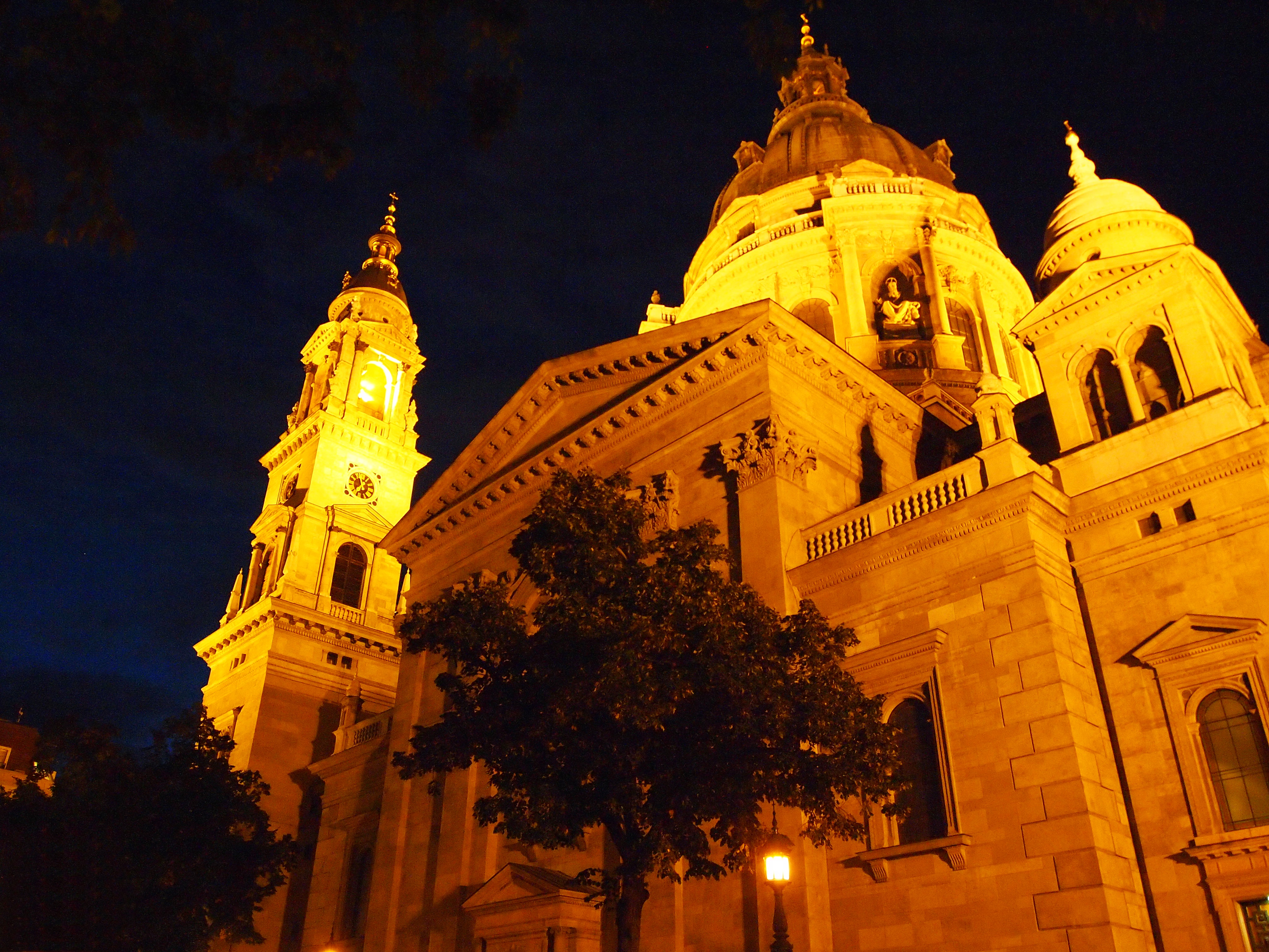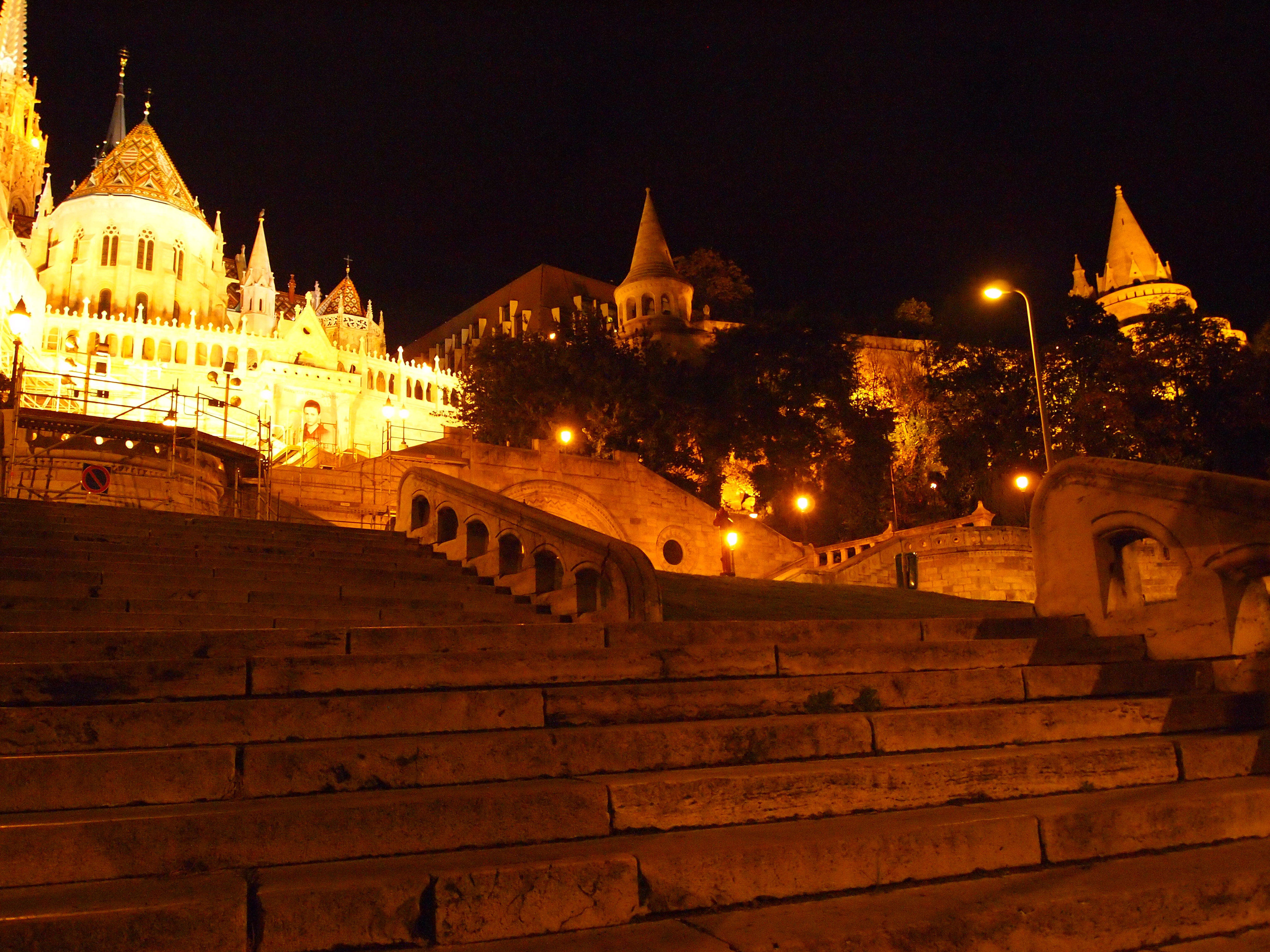 We left as it was beginning to get dark, perfect timing to walk around the brightly-lit city. Our guides said that the city would take on a whole new character once the sun went down, and it was hard to imagine what that might be until I actually saw it for myself. We stopped for dinner (yet another great Hungarian dish, a salmon steak with traditionally cooked vegetables, plus a cup of hot green tea – I was into the tea that day – and a creamy mousse for dessert) before setting out to explore.
