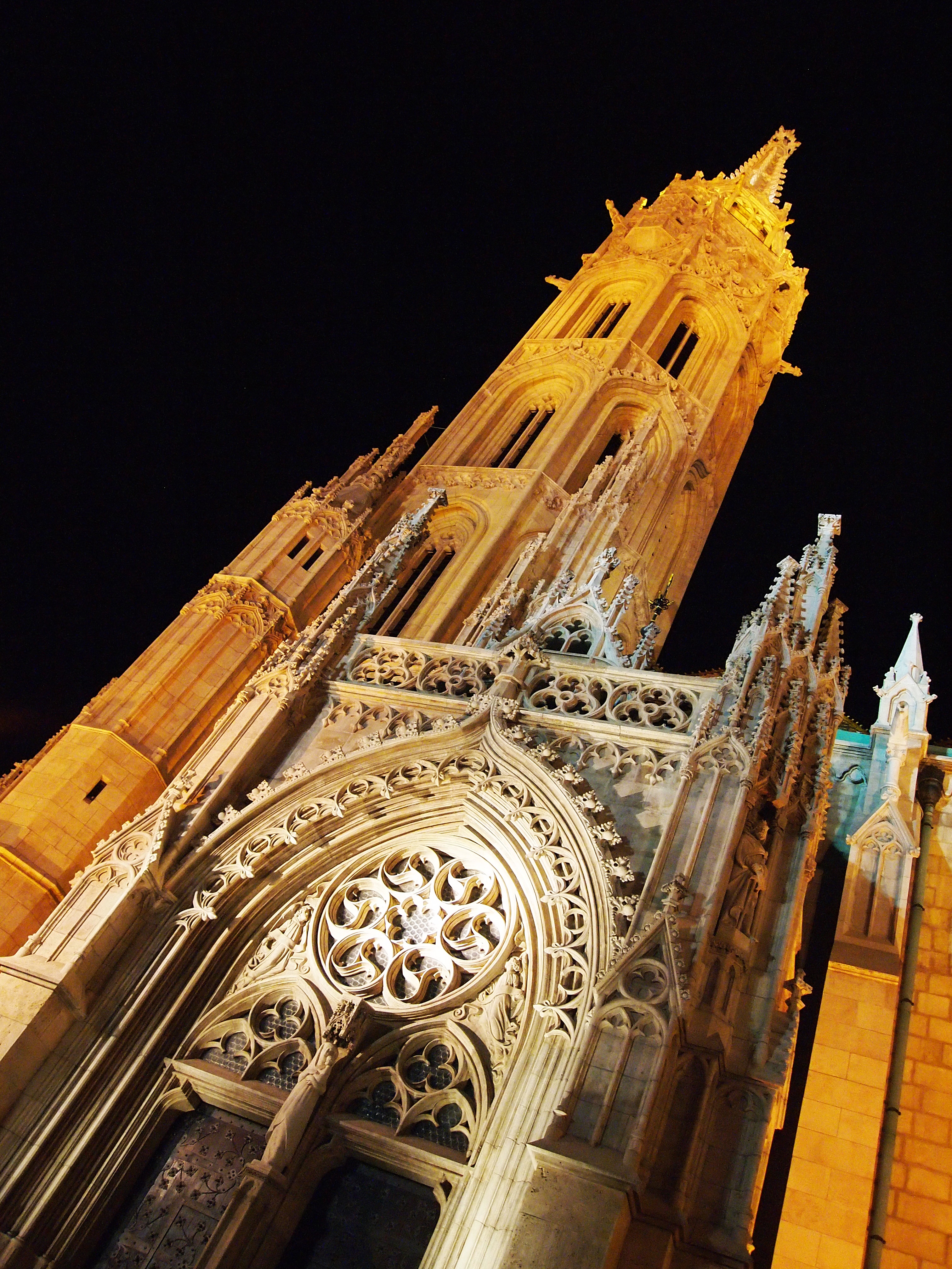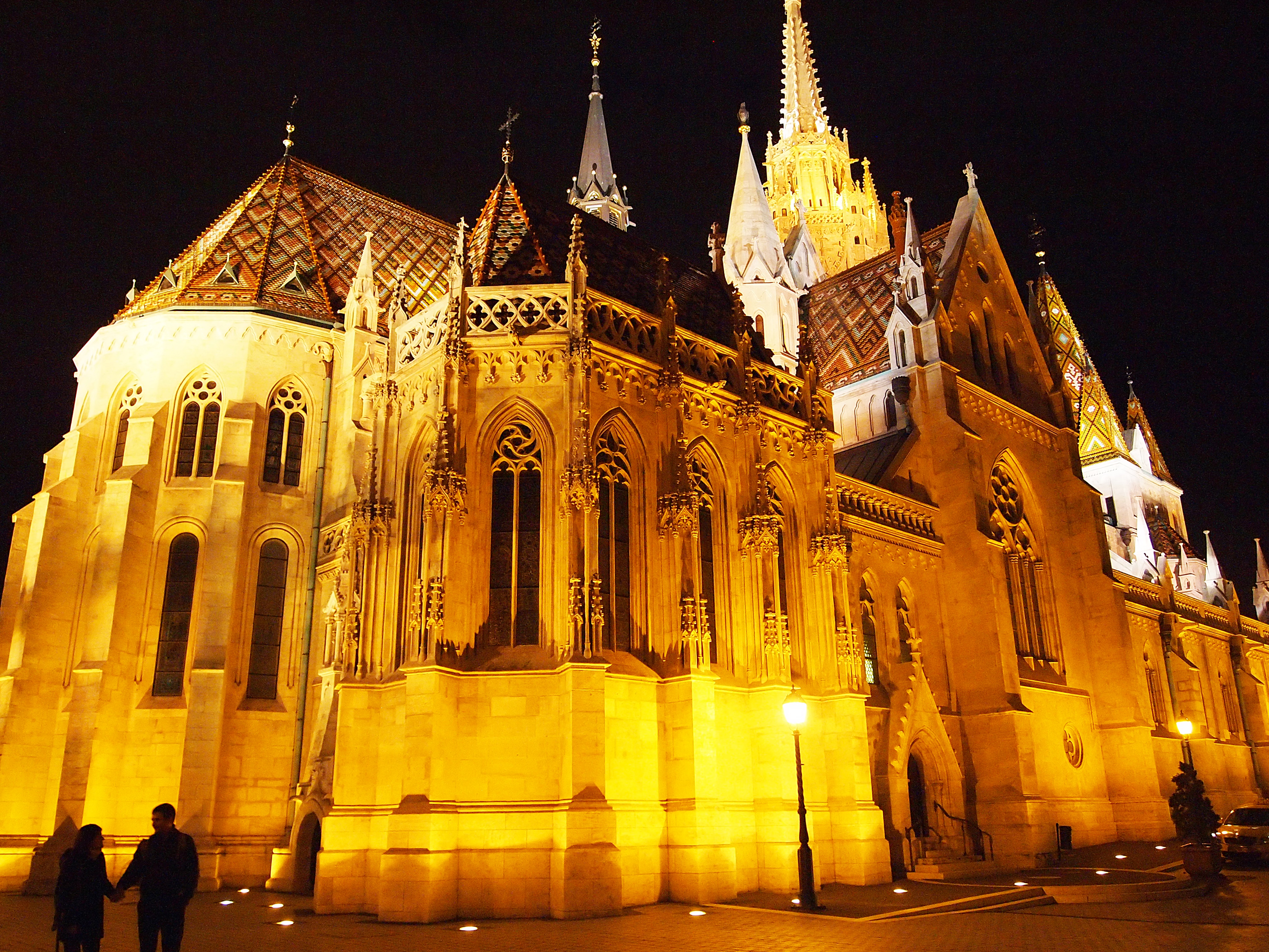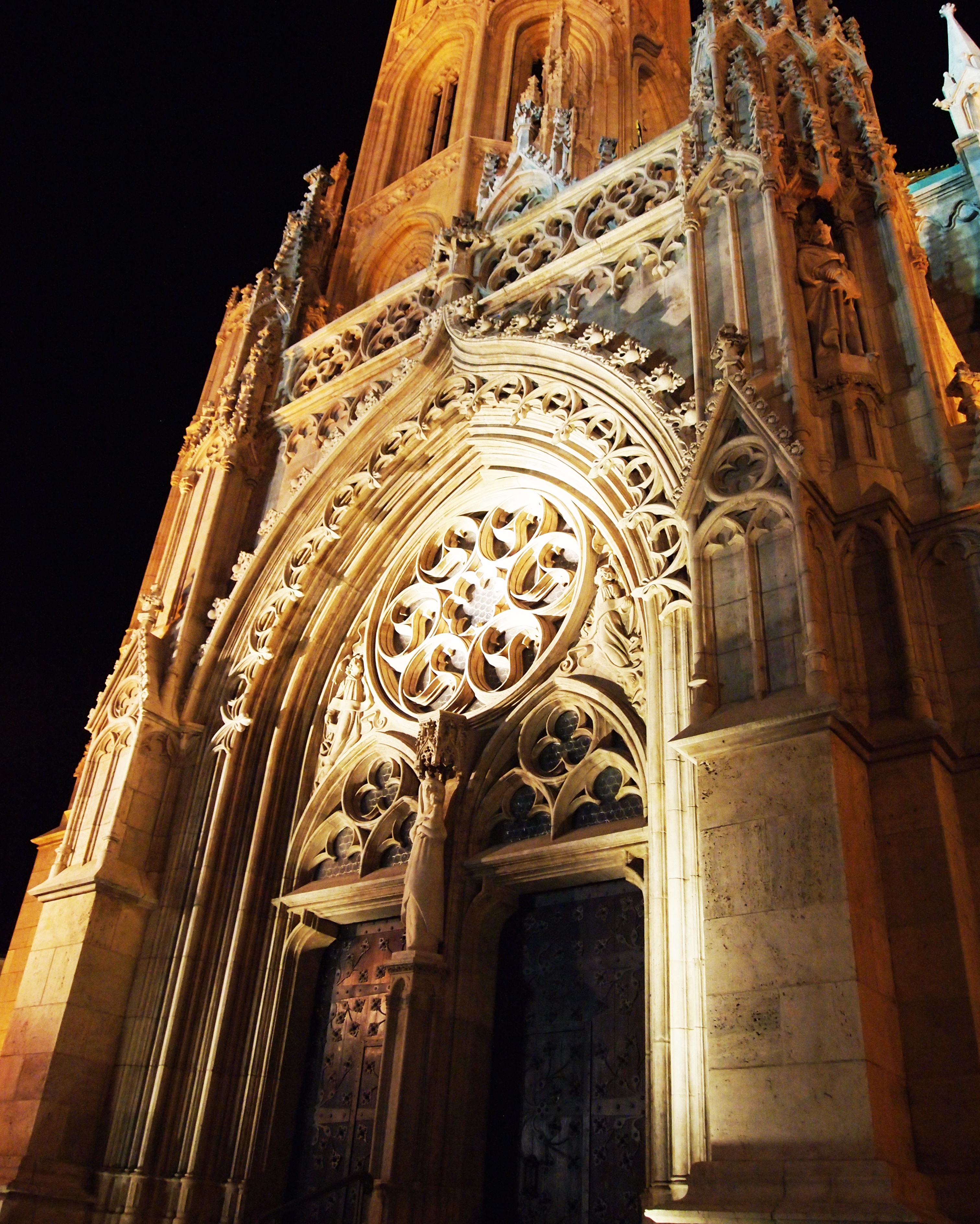 St. Stephen’s, all lit up at night.Welcome to Budapest!The sparkling Széchenyi Chain Bridge with Buda Castle in the background.Photos don’t do this justice, but here’s part of the city reflected in the waters of the Danube. It was so beautiful!Our first glimpse of Matthias Church and Halászbástya – the Fisherman’s Bastion. We felt like princesses climbing these stairs.Part of the Fisherman’s Bastion with Matthias Church in the background. The Fisherman’s Bastion was built at the turn of the century to commemorate the 1000th birthday of Hungary. Its seven towers represent the seven tribes that came together to found the country.It both looked and felt like a castle. There were live violinists adding elegant ambiance to the views, too.One of the seven towers.Mátyás-templom, or, Matthias Church. Its long and complicated history begins in 1015 and includes several reconstructions, a few coronations (and royal weddings), and even some time as a mosque.Some of the best panoramas of the Hungarian Parliament Building can be seen from the Fisherman’s Bastion.Just look at that Gothic architecture!~emoji with the heart eyes~One more because I really just can’t get enough of this building.Two passersby show the massive size of the church.And lastly, the icon of Budapest at night – the Hungarian Parliament Building, in all its sparkling splendor.