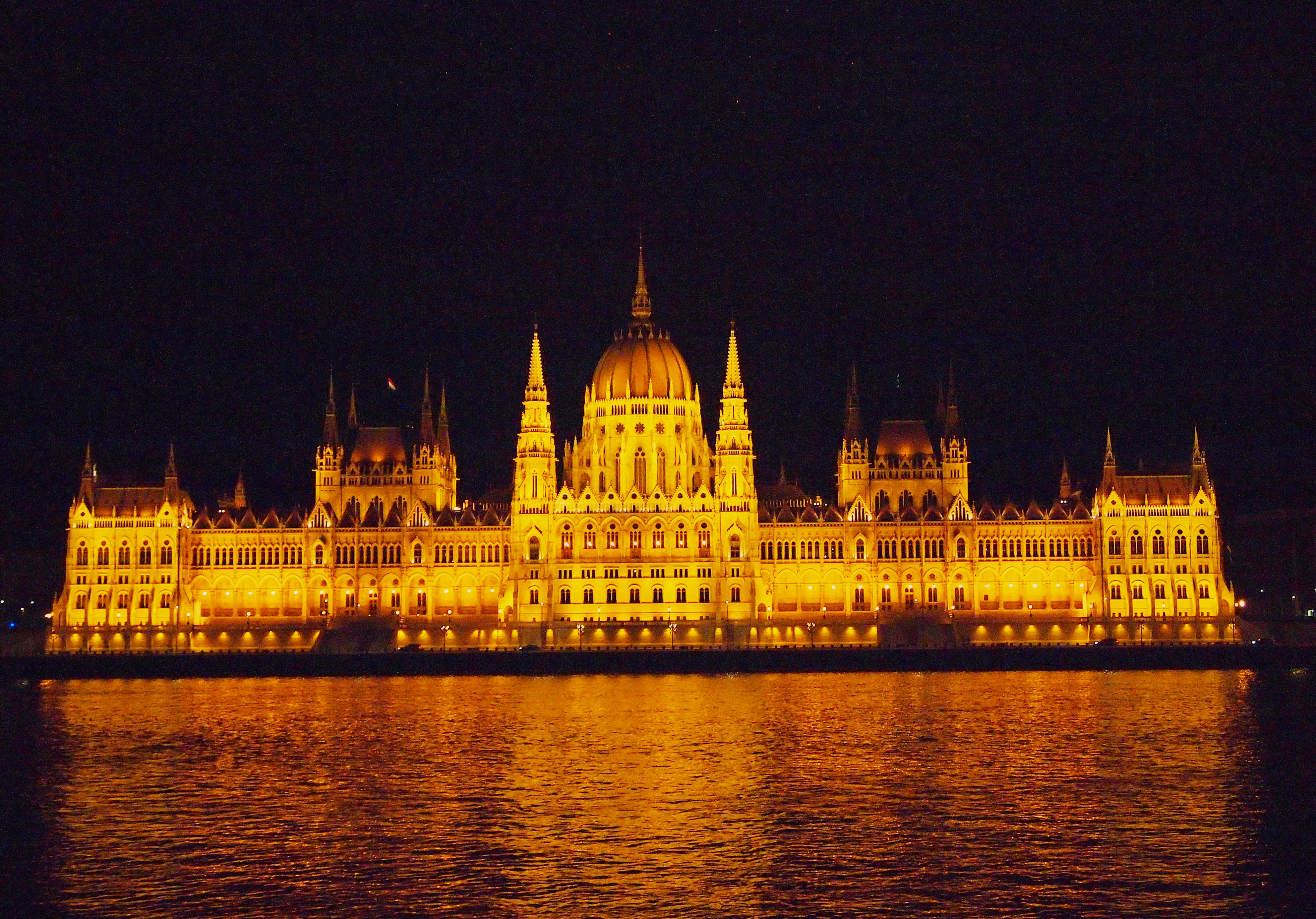 The Hungarian Parliament building, overlooking the Danube River at night.