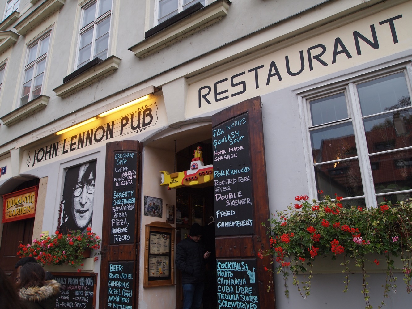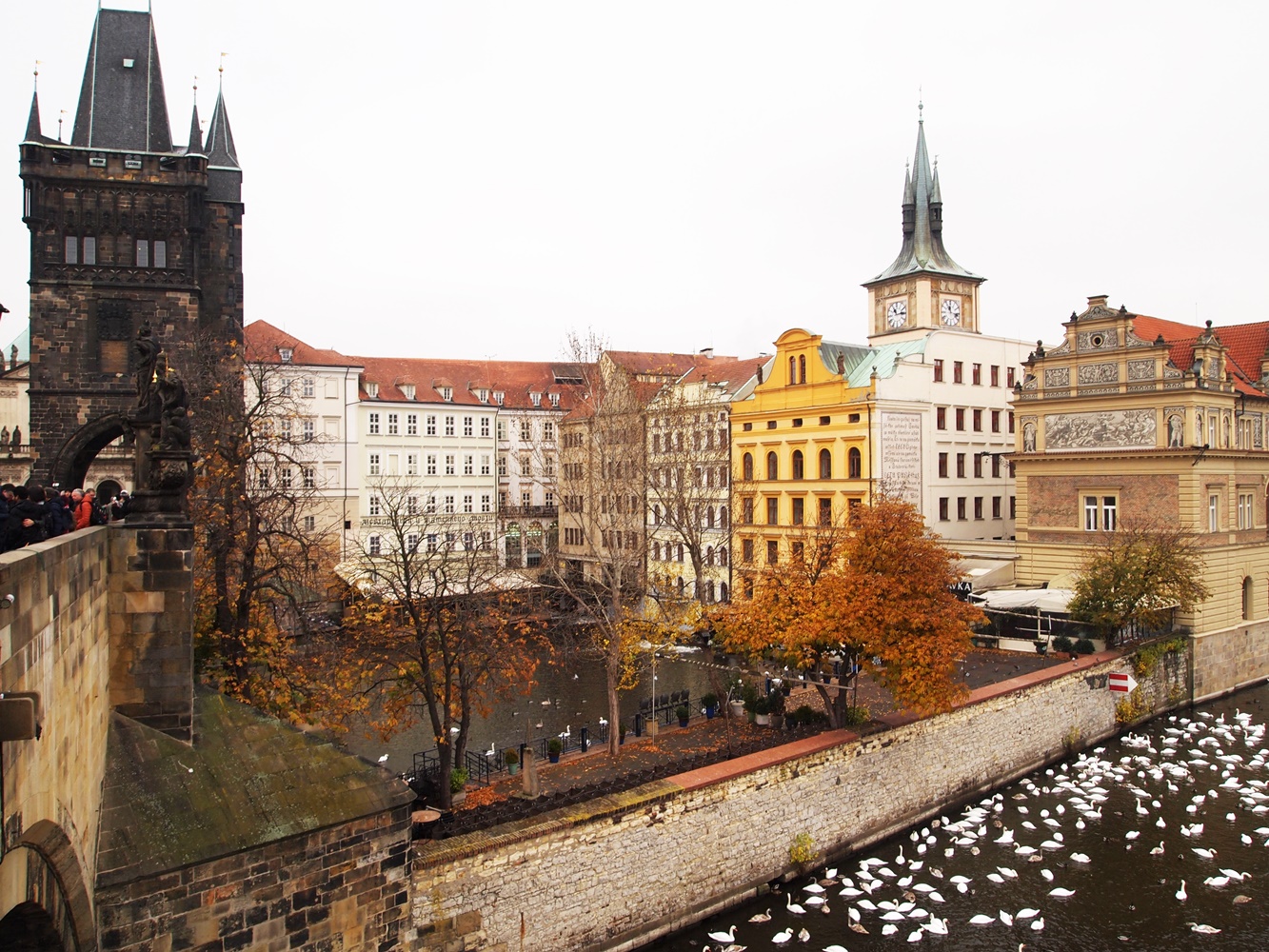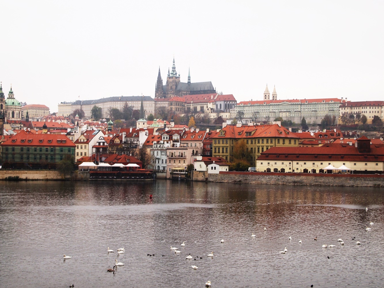 It wasn’t quiet winter yet, but it was definitely a chilly morning!Such charming architecture.The Charles Bridge stretches 2,000 feet over the Vltava River. Look closely at the far right of the photo – you can see the castle in the distance!Visitors leave their marks on the city in all sorts of ways.The Prague Castle dominates the view from the east side of the bridge.So many swans!Looking south down the Vltava.The bridge is pedestrian only, making it the perfect place for artists to set up displays and sell their work.Stepping into Prague’s western side felt like stepping back in time.Saw this storybook scene on the way to the John Lennon Wall.“Never doubt that a small group of thoughtful, committed citizens can change the world; indeed it is the only thing that ever has.”The wall has been a symbol of peace since 1988, when young people started painting anti-war and anti-communism messages on it. The graffiti changes every day as tourists and artists make their marks. This man added to the ambiance of the scene by playing songs by the Beatles.Group photo in front of the wall.After visiting the wall, we had lunch at the Beatles-themed John Lennon Pub.Because when in Prague…Then, we ran into the perfect desert place on our way to the castle. Prague is famous for its gingerbread, and we found a gingerbread bakery!We then made the trek up to the hill where the Strahov Monastery, castle, and miniature museum are located.Our first stop was the Strahov Monastery – home to one of the most beautiful libraries in the world.This room is called the Theological Hall and was built during the 1600s.The Theological Hall is the oldest part of the library.This room is called the Philosophical Hall. Unlike the Baroque-style Theological Hall, the Philosophical Hall was built in the Classical style of the early 18th century.The library now contains over 200,000 books.Then we headed next door to a little museum of miniature art.The paintings, engravings, and sculptures on display were all smaller than buttons. Visitors needed the help of magnifying glasses or microscope lenses to see the details properly.We stopped by the castle next but didn’t go in – mostly because this was the ticket line.But it all worked out okay – the view from the castle’s grounds made it all worth it!It got dark as we made our way back down the hill toward the Old Town. This is the view from the Charles Bridge at night.We ended the day with dinner at a little pub near Old Town Square. I’m still not sure what this dessert was, but it was the perfect way to end a wonderful weekend in Prague.
